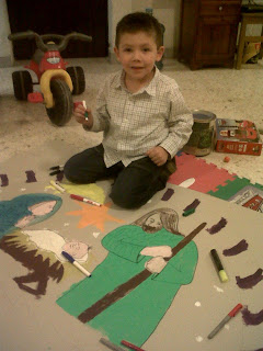 El caso es que, un día de esta semana, cuando llegué a la casa, me encontré esa lámina que debía ir a la basura, con un enorme trazo de un nacimiento que Lina dibujó. Andrés me esperaba con sus pinceles y unos botecitos de pintura de muchos colores.
